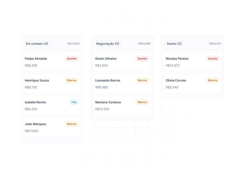 Arraste e solte oportunidades entre etapas e nunca perca um negócio.